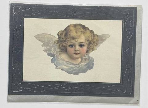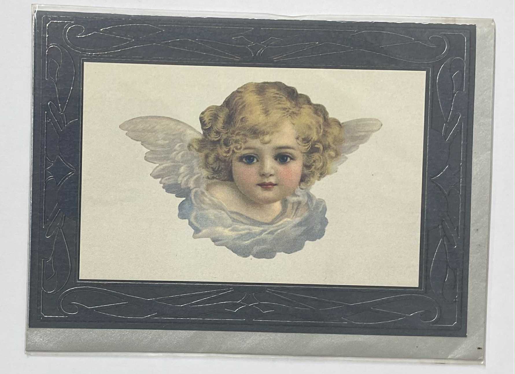 - Design One: A cherubic angel with golden curls and feathered wings gazes softly from the card, evoking serenity and innocence.