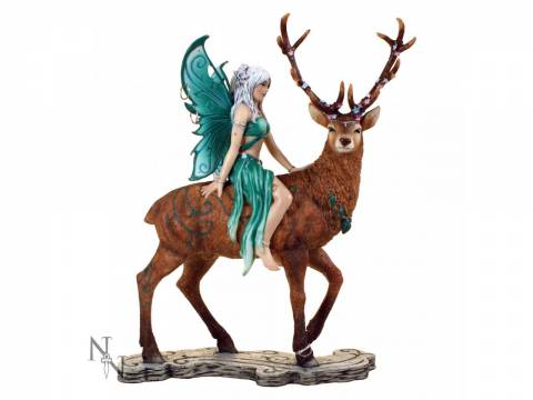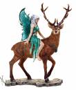A majestic fairy sits upon her companion Stag. Adorned in her turquoise dress, she rides peacefully on the stags back. The stag stood to attention, they journey together through the mystical forest.