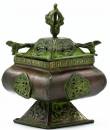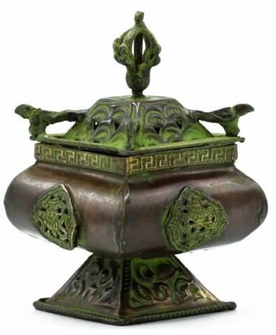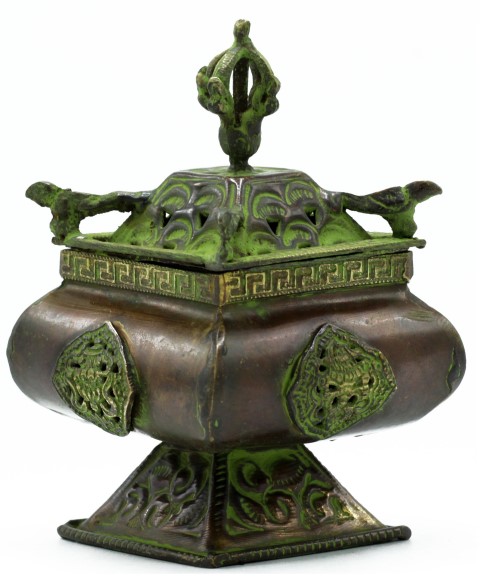 Cultivate a sense of tranquility and enrich your customers' home environment with the Brass Verdigris Tibetan Burner - Four Symbols Square Standing Pot. This unique burner features a square standing pot design adorned with imagery of the four celestial symbols: the dragon, phoenix, tiger, and tortoise. In Tibetan culture, these symbols represent the four cardinal directions, the four elements, and four virtues. The burner is crafted from brass with an  artfully induced Verdigris finish, giving it an  aged and sophisticated look.