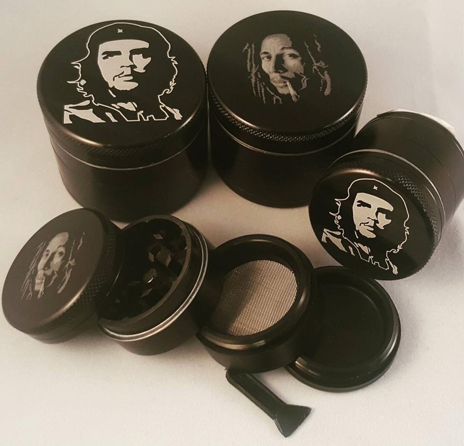 Featuring 2 cult revolutionary icons Che Geuvara & Bob Marley (please select with drop menu), these metal 4 part grinders have classic diamond cutting teeth and a sturdy sifting mesh with kief compartment/scraping tool.