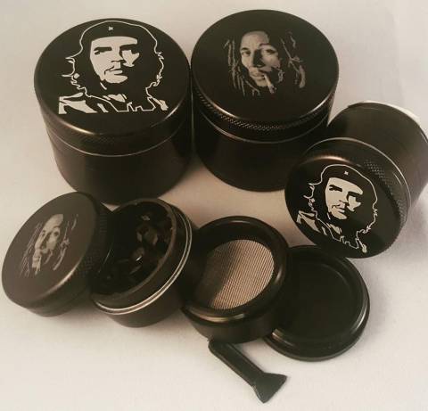 Featuring 2 cult revolutionary icons Che Geuvara & Bob Marley (please select with drop menu), these metal 4 part grinders have classic diamond cutting teeth and a sturdy sifting mesh with kief compartment/scraping tool.
