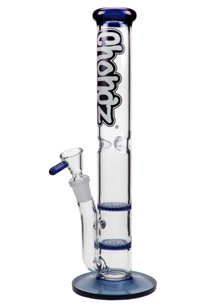 Chongz 'Chainsaw' Blue Accent 32cm £36.00Chongz ‘Chainsaw’; 32cm tall, 5mm thick glass waterpipe with ice points and a double honeycomb percolator Enter Quantity Weight: 2 kgProduct category: Glass