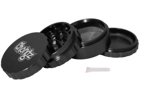 Ridged, 4 part grinder by Chongz. 2 parts to grind your material, one part to hold your herb and another to hold your crystals. Ridges make it easier for that extra tough grind. Available in 2 different colours.