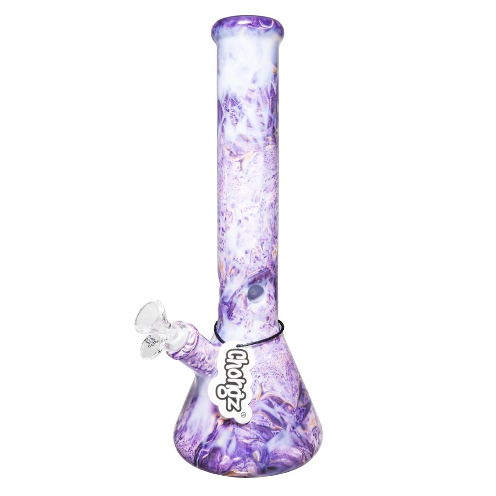 Introducing the Chongz "Tye Dye" 35cm Glass Waterpipe! This stunning piece features a mesmerizing tye dye marbled effect that adds a splash of color to your sessions. Crafted from thick borosilicate glass, it ensures durability while providing a smooth smoking experience. The removable down tube has an 18.5mm fitting, with a length of 14cm and bowl with a 14.5mm fitting, open-hole making for a quick cleaning experience and interchanging pieces making it easy to personalize, complete with a branded Chongz bowl, make it perfect for any enthusiast. Plus, with ice points for that extra chill, this waterpipe is a must-have for your collection!
