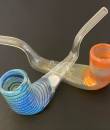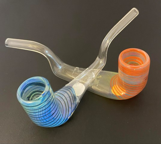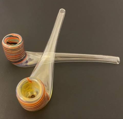 Colured glass pipes that come in two different stem styles that measure aprox 12.5cm on bent stem style, 13cm straight stem style, these styles will be chosen in random unless a note is left with order.
