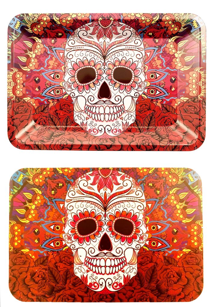 Keep all your rolling accessories on the tray and then snap on the magnetic cover, features vibrant day of the dead candy skull style art