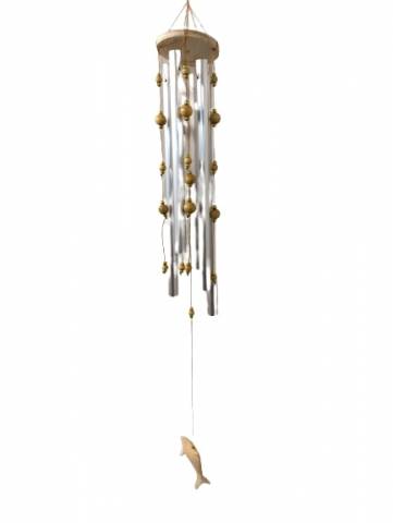 A 50cm mixed wood an metal windchime featuring a dolphin shaped paddle and bead work