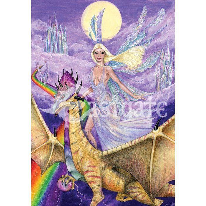 Let your imagination take flight with the stunning "Dragon Lady" fantasy art card by the talented artist Lauren. Measuring approximately 17.5 cm by 13 cm, this vibrant card showcases a captivating scene of celestial elegance and dragon-fueled power, perfect for fans of mystical creatures and enchanted realms.