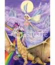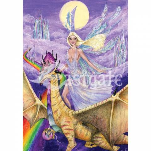 The artwork features a radiant dragon-riding lady adorned in flowing, moonlit robes, holding a glowing crystal staff. Crowned by the full moon and framed by lavender skies and dreamy cloud palaces, she exudes an aura of confidence and grace. Her noble dragon—golden-scaled with majestic wings—glides across a shimmering rainbow, adding a splash of color and magic to the fantasy landscape below. A castle looms in the distance, hinting at ancient secrets and magical adventures waiting to unfold.