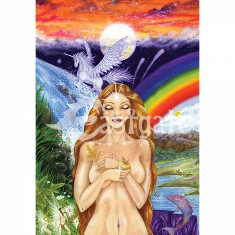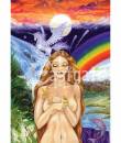 Step into a world of inner peace and transcendence with "Dream Journey" – a radiant and uplifting art card by visionary artist Lauren. At the heart of the image stands a serene, goddess-like figure, eyes closed in meditative calm, her posture inviting connection with the deeper self and the natural world.
