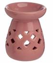 a ceramic oil burner with a decorative lattice design, typically made in a pastel color palette, designed to be used with essential oils or wax melts by placing a tea light underneath to heat the fragrance and disperse it into the air