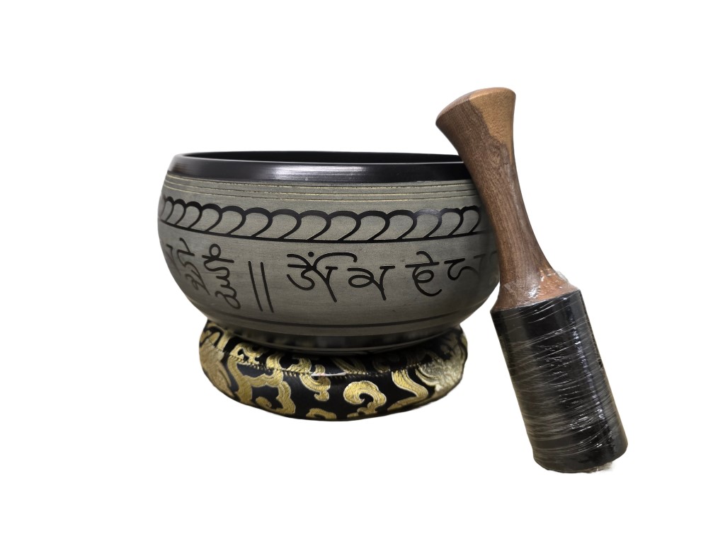 This singing bowl set comes with a sitting ring, singing bowl and wooden singing stick