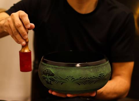 Hand-crafted for clarity and presence, the “mushroom” shape gives it a wide rim and fluted profile that amplifies vibration. The deep moss-green finish brings visual appeal and an air of calm sophistication — perfect for wellness, meditation, gift or décor contexts. Comes with Singing bowl, Wooden Beater and cussion ring
