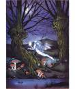 The artwork captures a serene yet mysterious woodland scene under a moonlit sky. A radiant fairy glides through the air, her delicate, gossamer wings aglow with a soft celestial light. She floats effortlessly between towering ancient trees, whose bark is blanketed in moss and whose roots cradle glowing mushrooms and enchanted creatures peeking out from their hiding places. The use of deep purples, moody blues, and glowing highlights creates a dreamlike atmosphere that draws the viewer into a peaceful, spellbound state.