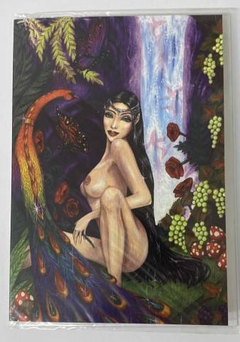 With long, dark hair and an elegant silver circlet, the fae embodies natural beauty and mysticism. A radiant peacock and fluttering butterflies lend vibrant colour, while grapes, roses, toadstools, and lush greenery create a sensuous and fertile landscape straight from a midsummer’s fairy tale.