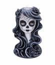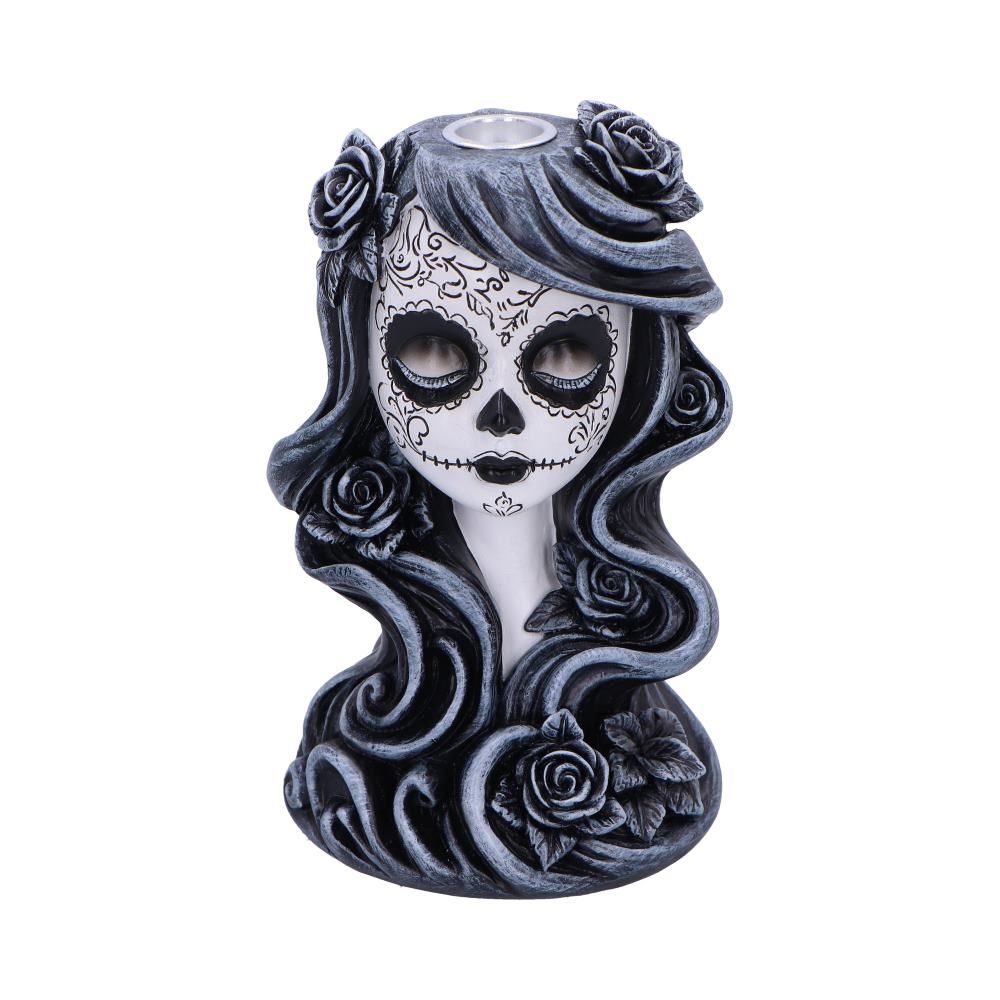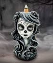 - A hauntingly elegant backflow incense burner crafted from durable resin, portraying a woman adorned with traditional Day of the Dead makeup.