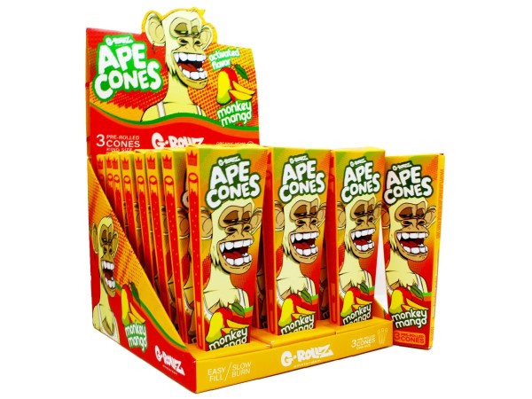 G-Rollz Mango Ape Cones. The juicy taste of Mango's that gives your mouth a tropical hit. Simply squeeze the pop filter to activate leave a burst of flavour to bring you the traditional taste of mango. Crafted in France the new ape cones from G-Rollz are produced with finely pressed organic hemp fibred and acacia tree sap as an all-natural gum line. These cones include a protective paper to keep their original shape and prevent any damage. Use the paper as a funnel to fill the cone up. G-Rollz have really gone out their way to make efficient as possible. 2 Blunt Cones Per Tube Flavour: Mango Hemp Pop Cones Tobacco & Nicotine Free