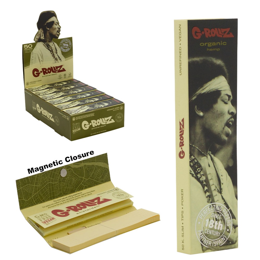 These G-Rollz papers are crafted in France using finely pressed plant-fibers and acacia tree sap as an all-natural gumline. All ingredients are natural to provide a pure rolling experience.