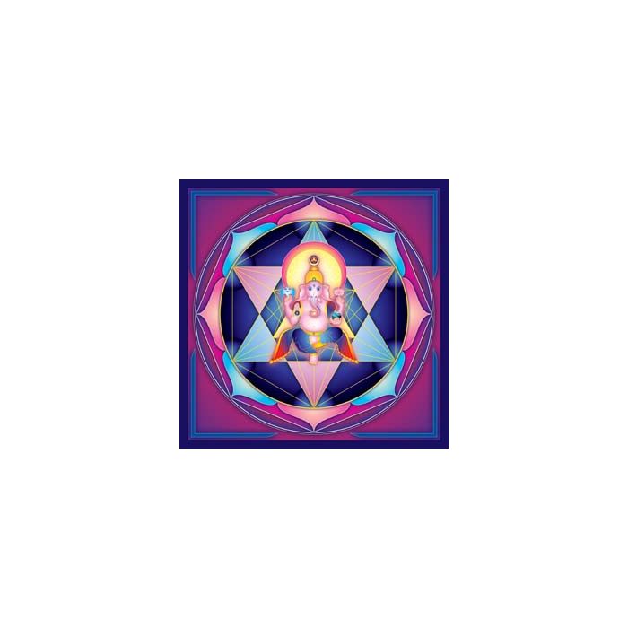 At the center of this mesmerizing design sits Ganesh, the guardian of thresholds and the destroyer of obstacles. He is framed within an intricate mandala of vivid blues, purples, and pinks, representing balance, wisdom, and divine energy. Sacred geometry elements form a radiant backdrop that enhances the spiritual resonance of the image, promoting harmony and focused intention.