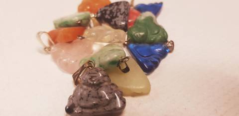 These gemstone buddahs are availible in various different crystal forms. They have a teardrop on to make it wearable as a necklace