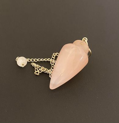 The most commonly used tool for dowsing is a pendulum; a pendulum is a weighted object usually a crystal or gemstone that is hung from a metal chain or pendant that allows the user to tap into their intuition for spiritual guidance. Rose Quartz is the crystal of unconditional love and promotes harmony and attraction with others as well as self-love. Rose Quartz aids in smoothing over emotional turmoil and enhances self-confidence and belief. This is a perfect pendulum to use when asking questions pertaining to mattes of the heart whether that be existing relationships or relationships yet to happen. This comes in a choice of size.