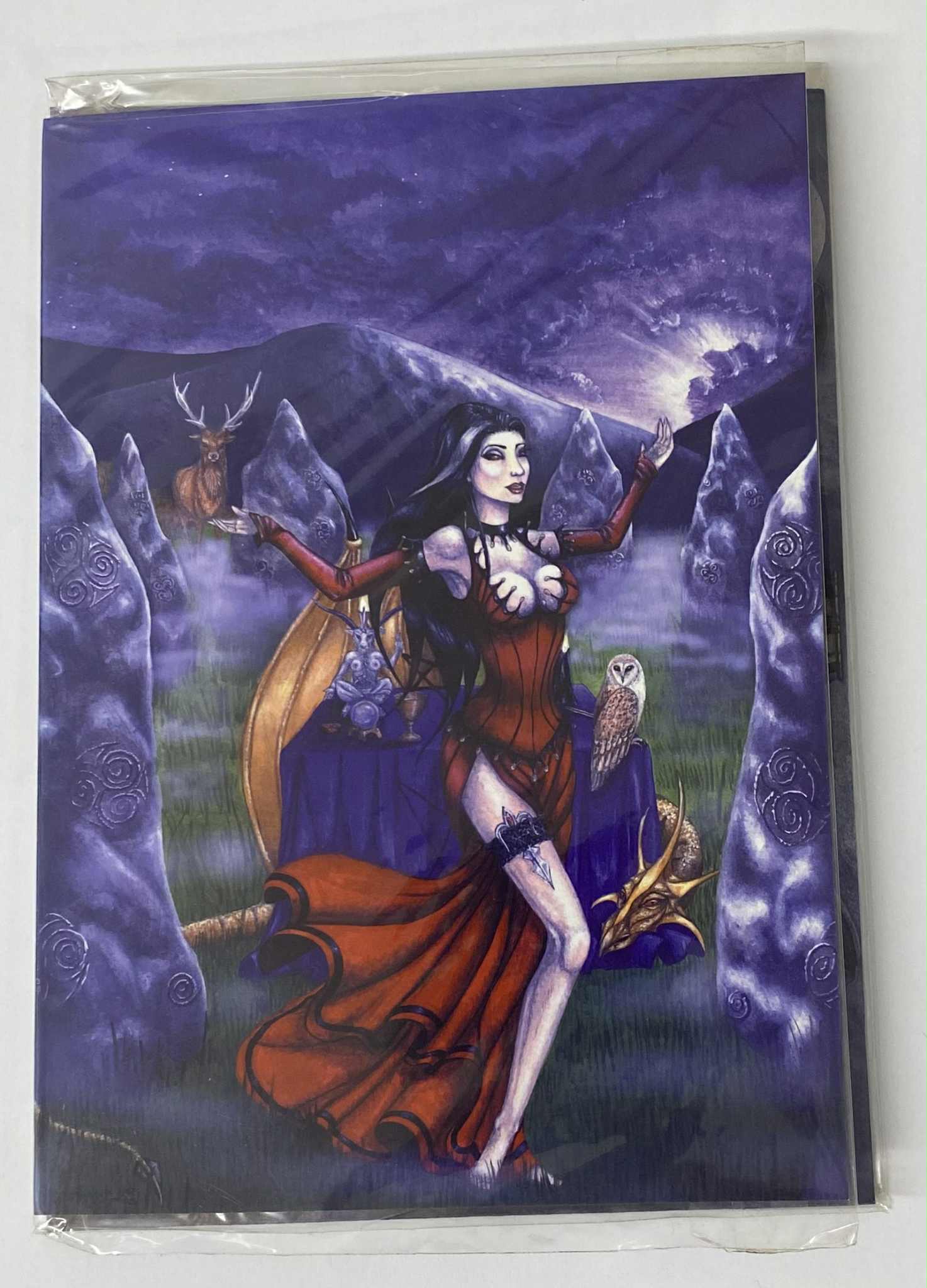 Invoke the power of the sacred night with the Gothic Moon Enchantress Card, a mystical vision brought to life by gothic fantasy artist Lauren. In this stunning artwork, the enchantress stands amidst an ancient stone circle, her arms raised to the moon as if summoning the forces of nature.
