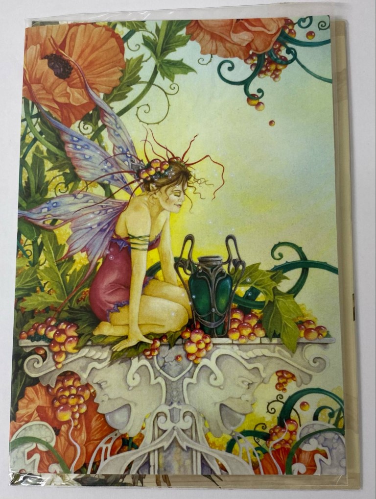 Vibrant berries, curling vines, and warm golden hues surround the faery in a dreamy, Art Nouveau-inspired setting. Ravenscroft’s detailed brushwork and ethereal aesthetic breathe life into this magical scene, perfect for sending heartfelt wishes or inspiring your own daydreams.