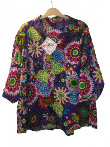 Stand out in vibrant style with this Gringo Fair Trade shirt, featuring an explosion of colorful mandala-inspired patterns. Crafted with care from lightweight, breathable fabric, this unique piece blends comfort with eye-catching design. The rich mix of purples, greens, pinks, and blues creates a playful boho vibe—perfect for festivals, casual outings, or adding flair to your everyday wardrobe.