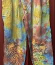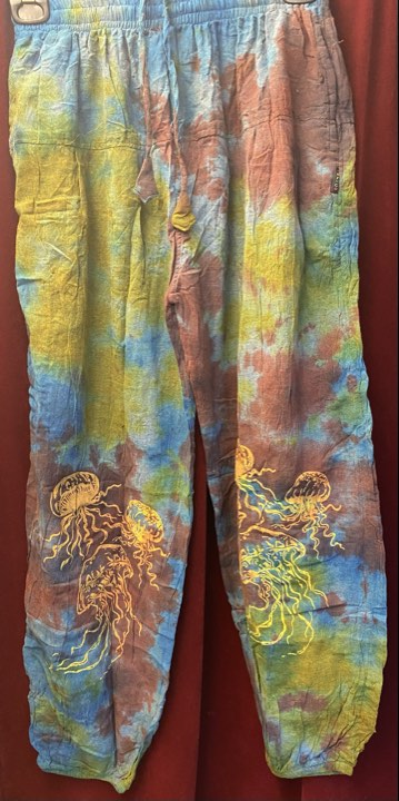 These gorgeously dyed harem trousers are a must for the summer/ festival season. Elasticated at both top and bottom, ensuring you a nice snug fit. Breathable, woven cotton. Please be aware of this when purchasing from us as our items do vary from garment to garment, depending on the dyes and fabrics available and sometimes down to the mood of the person creating our beautiful pieces of art. Comes in size medium