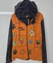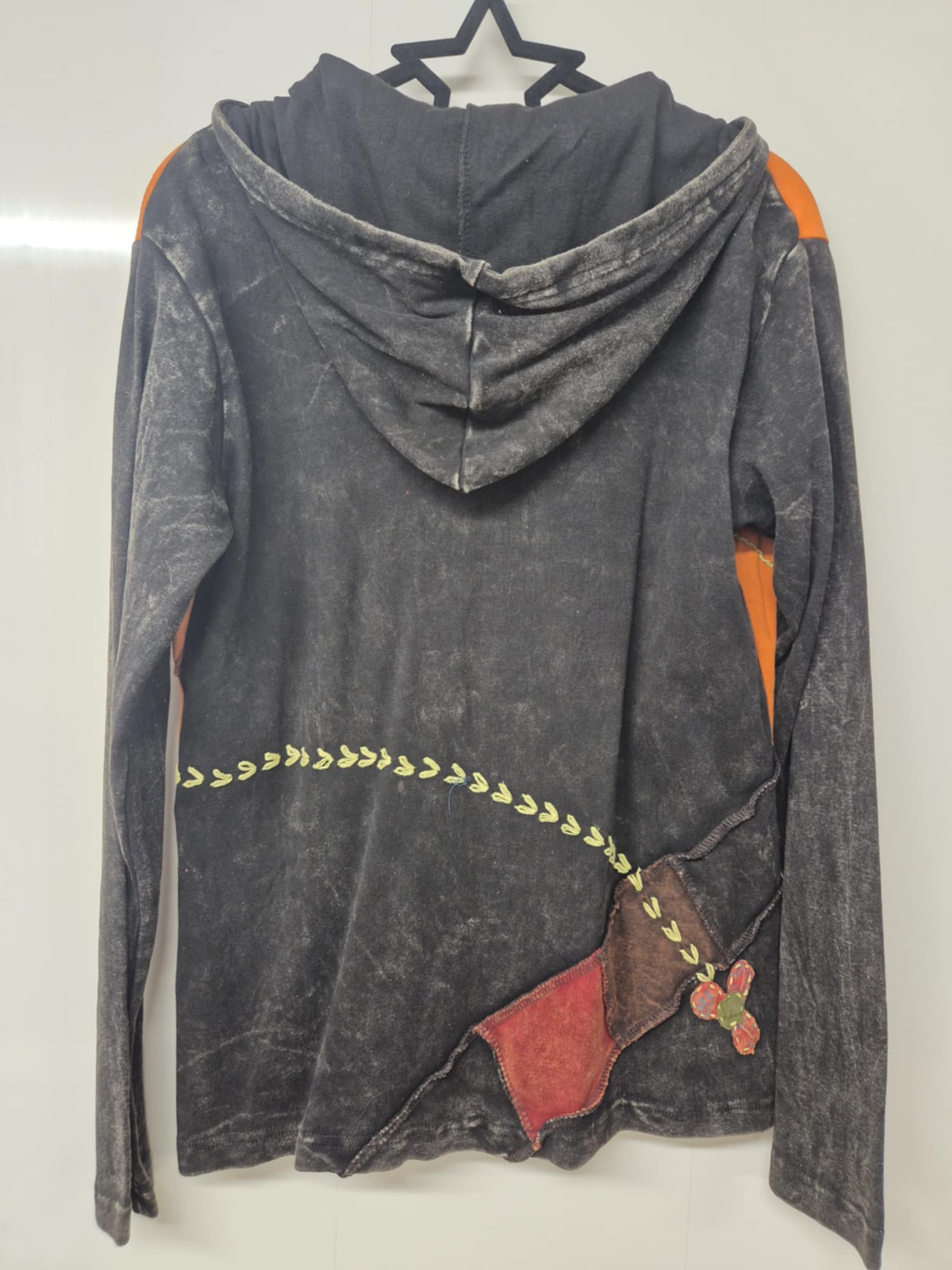 The rich orange body contrasts beautifully with washed black sleeves and hood, giving it that signature boho, lived-in look. Finished with raw-edge detailing, textured stitching, and a front zip, this hoodie blends creativity and comfort. A drawstring hood and pockets complete the laid-back, functional style.