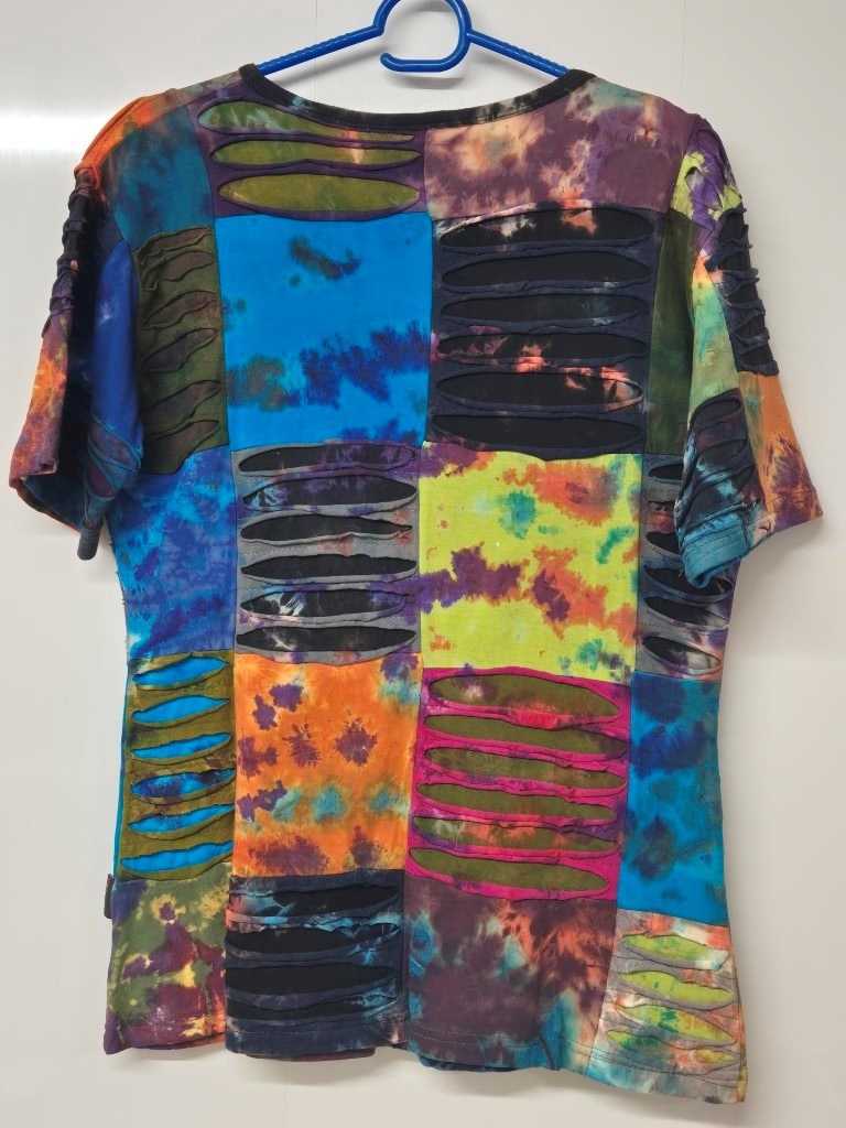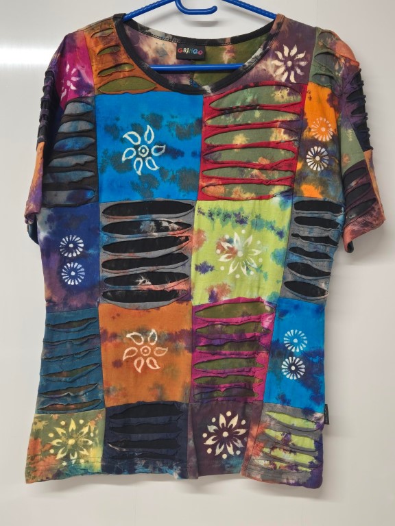 Add a burst of bohemian energy to your wardrobe with this eye-catching Gringo Short Sleeve Patchwork T-Shirt. Crafted from a soft, breathable cotton fabric, this handmade t-shirt features a vivid array of tie-dye panels stitched together in a unique patchwork design.