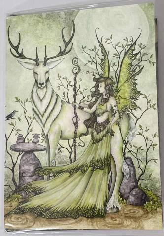 Enter a realm of enchantment with the Guardian card, illustrated by the acclaimed fantasy artist Amy Brown. This graceful scene features a serene forest fairy standing beside a majestic white stag, symbolizing protection, wisdom, and natural harmony. Surrounded by moonlight and forest magic, the artwork evokes a sense of peace and spiritual guardianship.