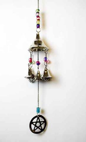 Hanging Brass Pentagram Decoration £8.50A hanging brass pentagram chime featuring bells and coloured beads Enter Quantity Weight: 1 kgProduct category: Mobiles, Wind Chimes & Hanging Ornaments