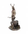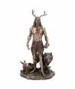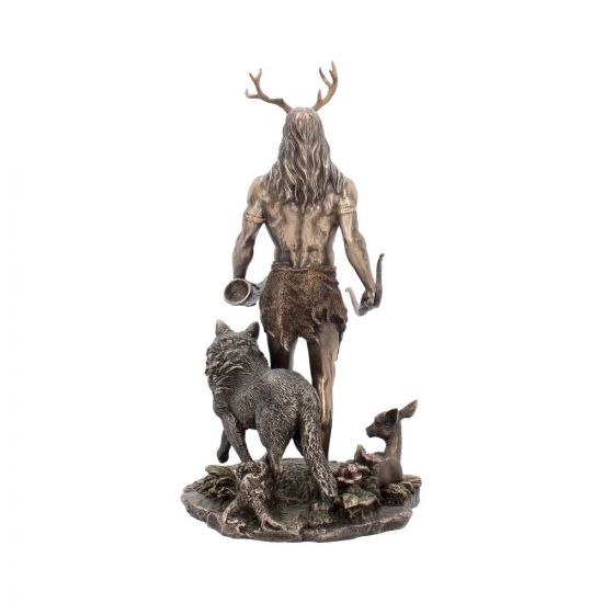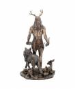 Standing proudly in the forest, Herne, God of the Hunt looks around, a shortbow in his right hand, a hunting horn in his left. He wears only a fur wrapped around his waist to protect his modesty. A snake slithers around his neck below his shoulder-length hair, and large antlers emerge from his head. At his feet, a wolf prowls, ready to join the hunt, while a faun sits and looks unafraid. Perfect for the centerpiece of any altar. Pagan lord of the forest.
