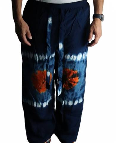 these hippie pants come in a fascinating japanese style with a hallucination of tie dye blue and orange .Stand out bright and bursting with vibrancy.