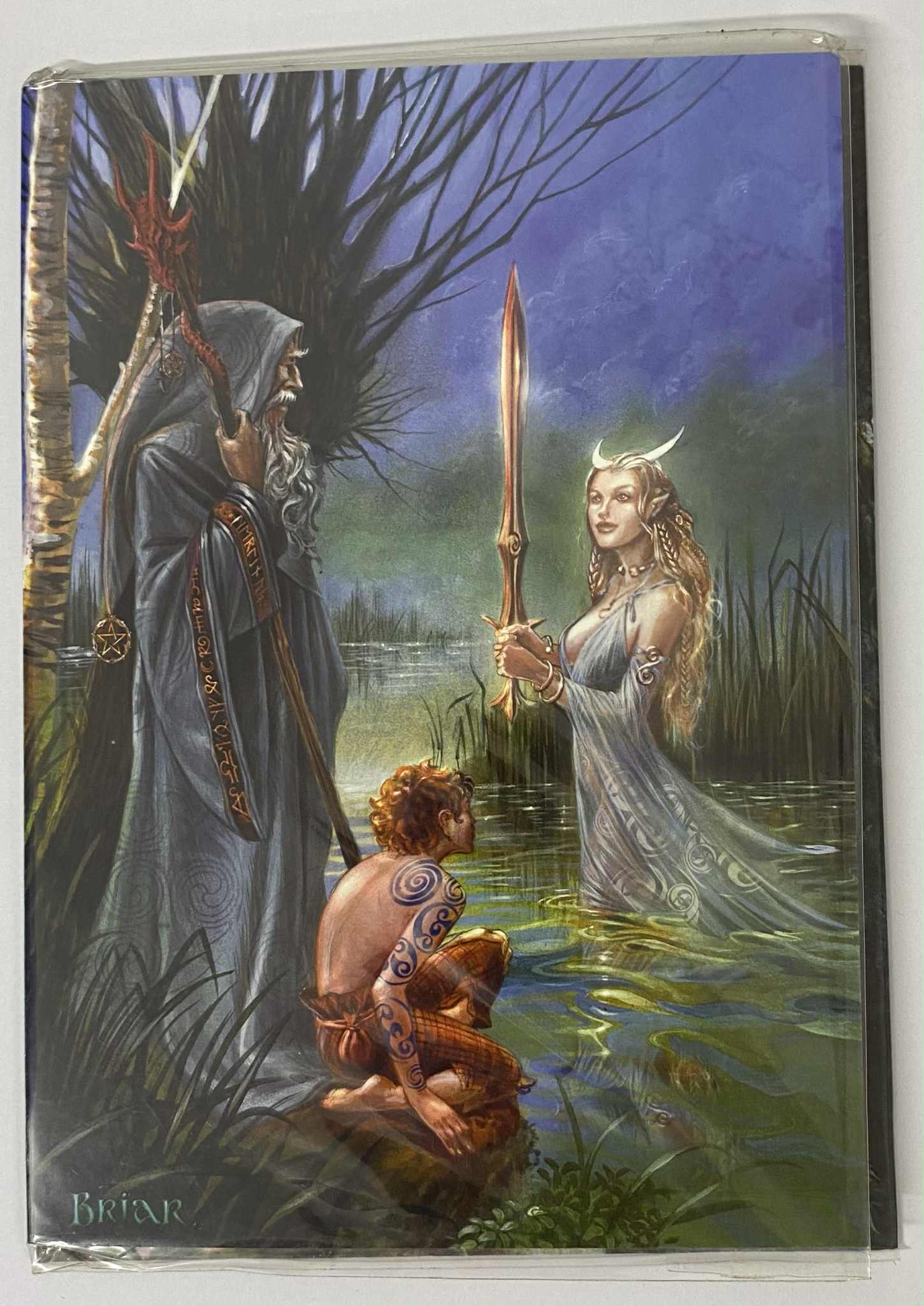 Step into the realm of Arthurian legend with the Lady of the Lake card, featuring spellbinding artwork by Briar. In this mystical scene, the ethereal Lady rises from the sacred waters, presenting a glowing sword to a young warrior, as a druidic figure looks on — a moment steeped in magic, prophecy, and destiny.