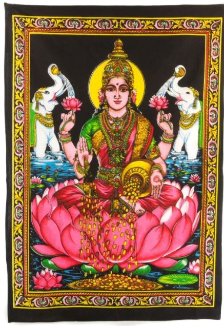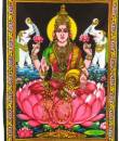 This beautiful poster sized wall hanging features the Hindu goddess Lakshmi. Known as the goddess of prosperity, wealth and good luck, she is one of the most popular Hindu goddesses and is usually portrayed as a beautiful woman with four arms. The vibrant colours and detailed artwork on these hangings will brighten up any wall.