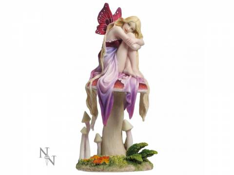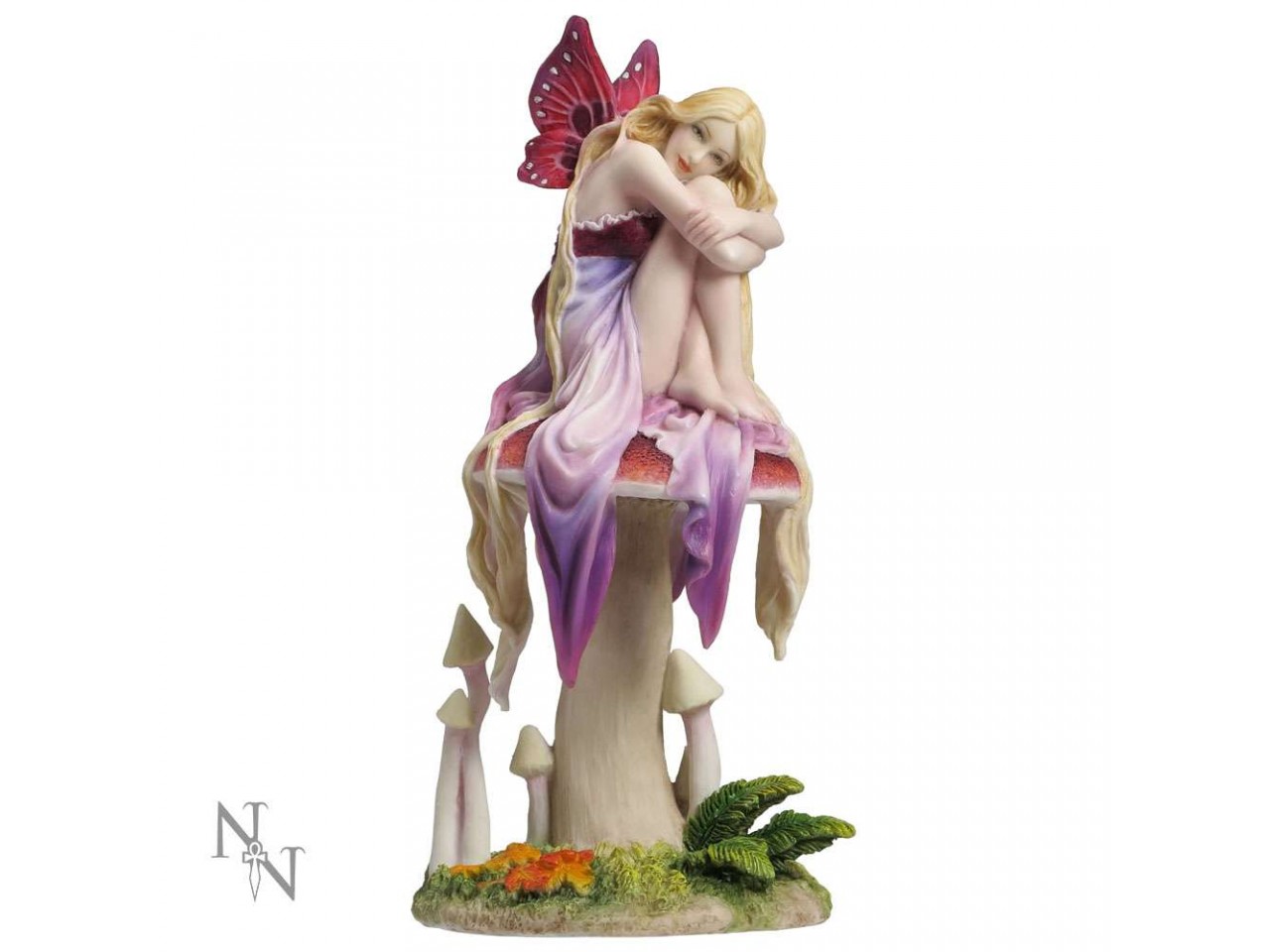 She sits innocently upon a toadstool in a flowing Lavendar dress. She is surrounded by flora and mushrooms. She holds her legs up in her arms as she looks to the side with an air of mischief on her face and a glint in her eye. To be expected from the littlest fairy. Cast in resin and beautifully hand painted.