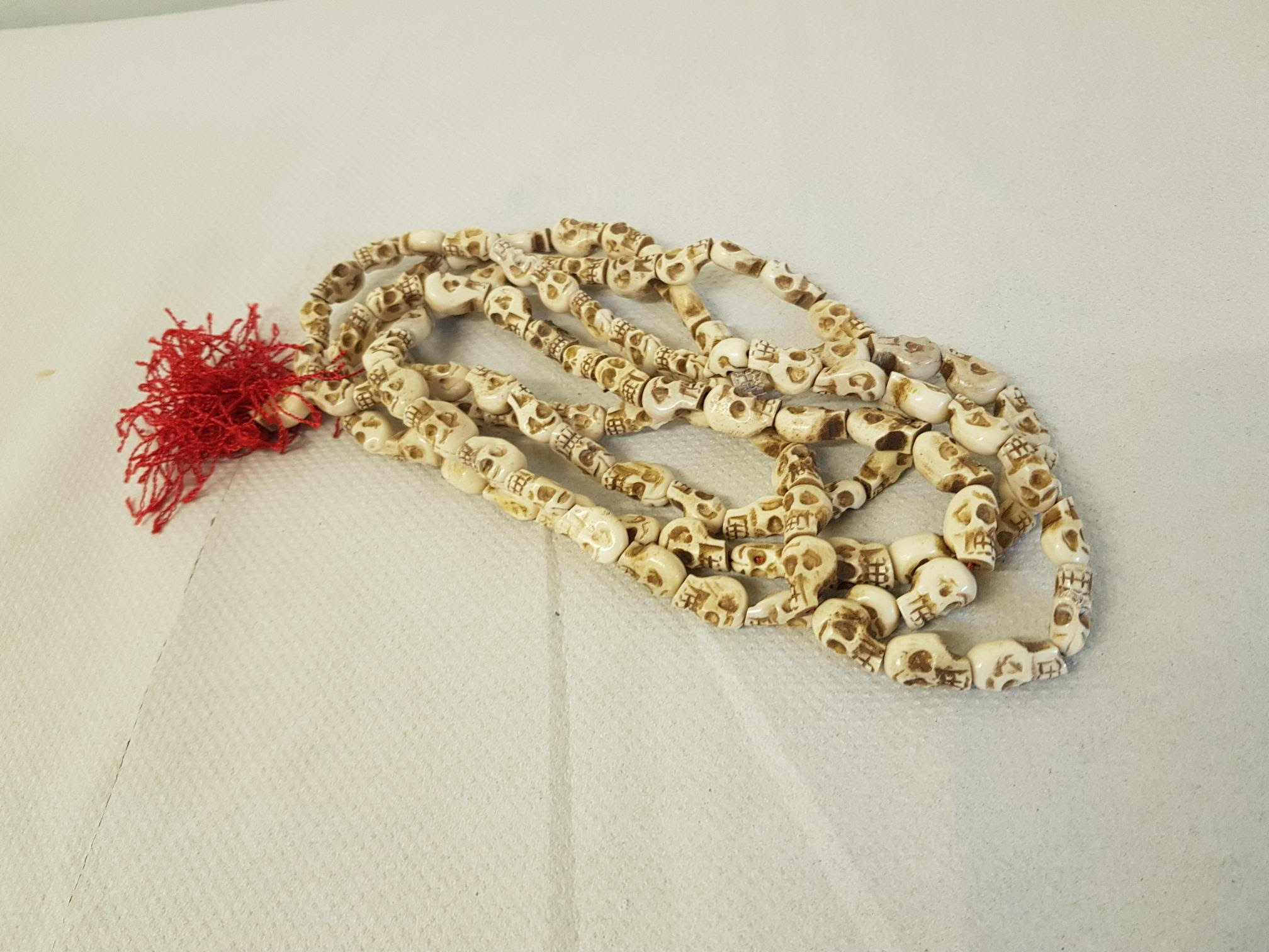 Mala bone skull shaped beads £70.00Traditional Mala bone crafted into skull shapes. Used in the practise of buddhism teachings. 108 beads on a red plume. Enter Quantity Weight: 141 kgSize: LargePack Size: Single