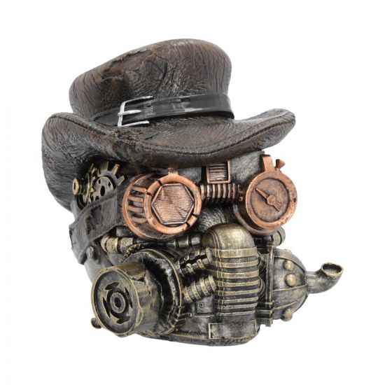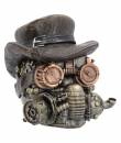 This piece would make a creepy addition to any Steampunk collection. Wearing a modified gas mask, this anthropoid's face is completely covered with gauges, cogs, bolts and pipes. A leather-like hat sits atop its head, while large buckles hold his mask and goggles in place. Cast in the finest resin before being hand-painted, this piece would make a great display piece for any alternative store.