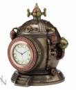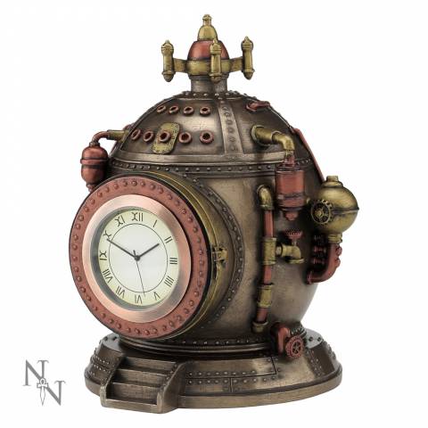 This time-travelling clock would look fine on any mad scientist's mantelpiece. On a sturdy base, 3 small steps leading off the ground to the font, this Victorian time machine is seemingly made out of bronze, mysterious pipes, gears and funnels emerging from its rounded sides. A large gear secures the entry hatch at the rear, and on top a turbine shows when the mechanism is engaged. The front is dominated by a large clock, numbers elegantly picked out in roman numerals. The perfect gift for anyone who feels they need more hours in the day, the top lifts off to reveal a spacious interior, bending space as well as time.