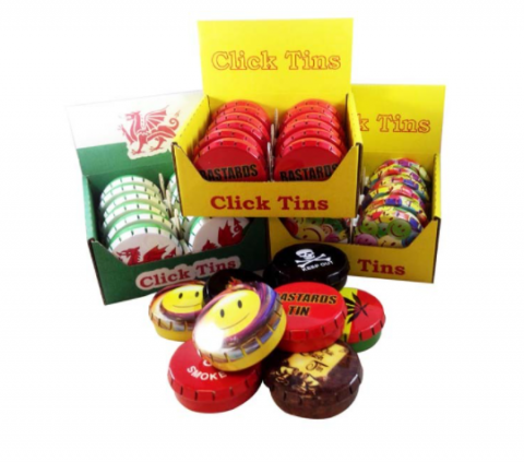 Novelty Click Tin £1.25Various amounts of designs, colours and pictures printed on these portable little tins for your bits Design WTFSkullsleafsmiley faceF offbastardssmiley facesBulldog Enter Quantity Weight: 1 kgProduct category: Storage & Rolling TraysDesign: Skulls