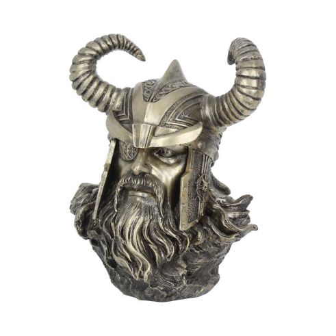 Cast in the finest resin before being given a bronzed finish, this Norse bust comes from alternative brand Nemesis Now's giftware collection. Odin was the Father of all the Gods and men and can travel to any realm in the nine Nordic worlds. He is a God of magick, wisdom, wit, learning and in later times was associated with war and bloodshed. Here he can be seen with long hair cascading below his ornate horned helmet. On his right eye, a small patch is worn after sacrificing an eye to gain more a more sacred and diving level of Wisdom. Standing 21.5cm tall.