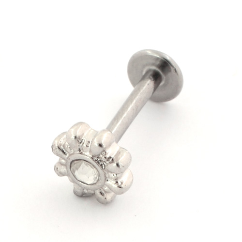 Brighten up your look with this elegant ornate labret bar, featuring a charming flower-inspired design accented with a single sparkling crystal at its center. The delicate detailing adds a soft, feminine touch, making it a perfect choice for everyday wear or a subtle statement.