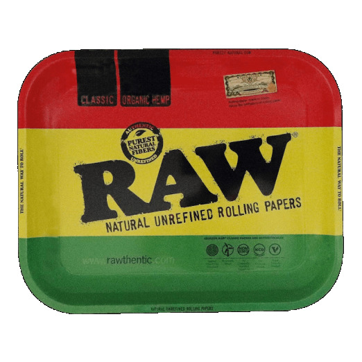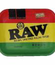 The RAW Rasta Metal Rolling Tray is a durable, high-quality metal tray featuring a distinctive Rasta-themed color design in green, yellow, and red. It offers a smooth, non-stick surface with high, curved edges to prevent spills and keep rolling materials contained.