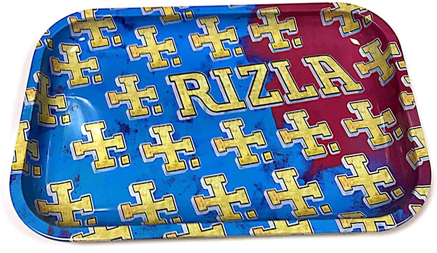 This tray features multiple Rizla logos scattered against a blue and pink background. The back of these trays are plain gold in colour.