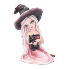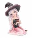The beautiful Rosa sits and lovingly cradles her mischievous familiar. Her sheer pink dress cascades over her knees and her long blonde hair flows over her arms and shoulders. Her outfit completed with a wonderful witches hat.