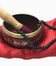 This handcrafted bowl features a vibrant crimson-red finish complemented by golden engravings and a brass rim, embodying both elegance and purpose. It comes complete with a padded red silk cushion, a natural wood and suede beater for sound resonance, and a string of mala beads—perfect for mantra recitation or focused meditation.