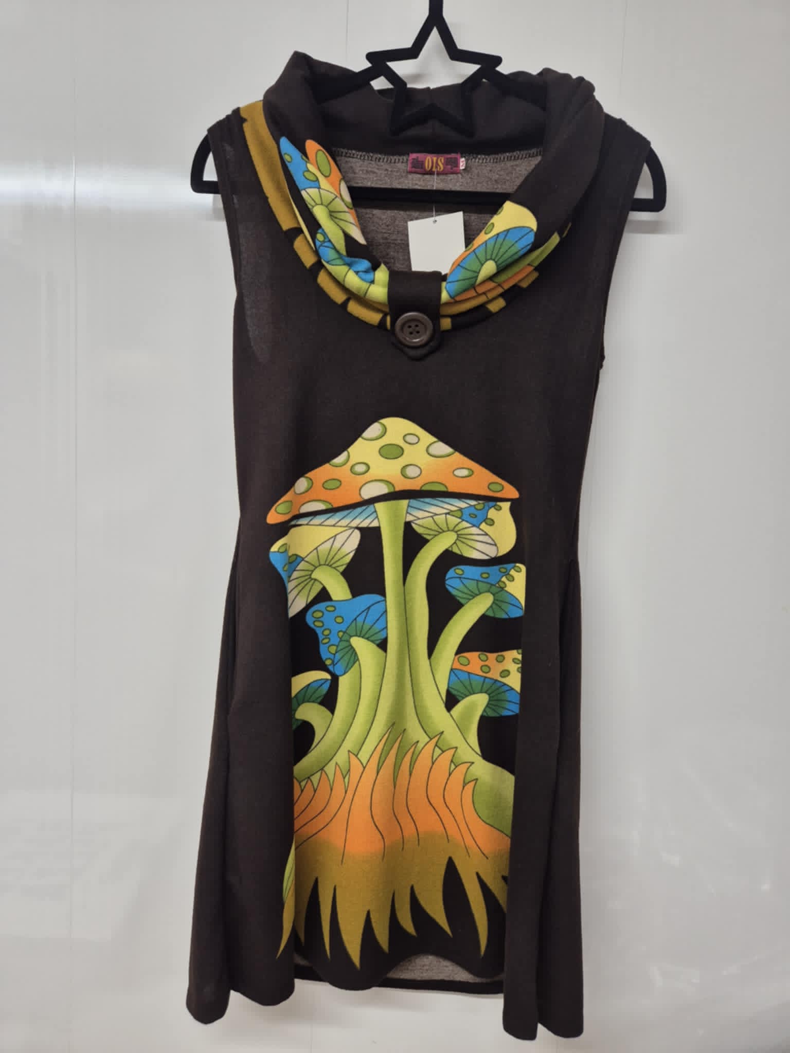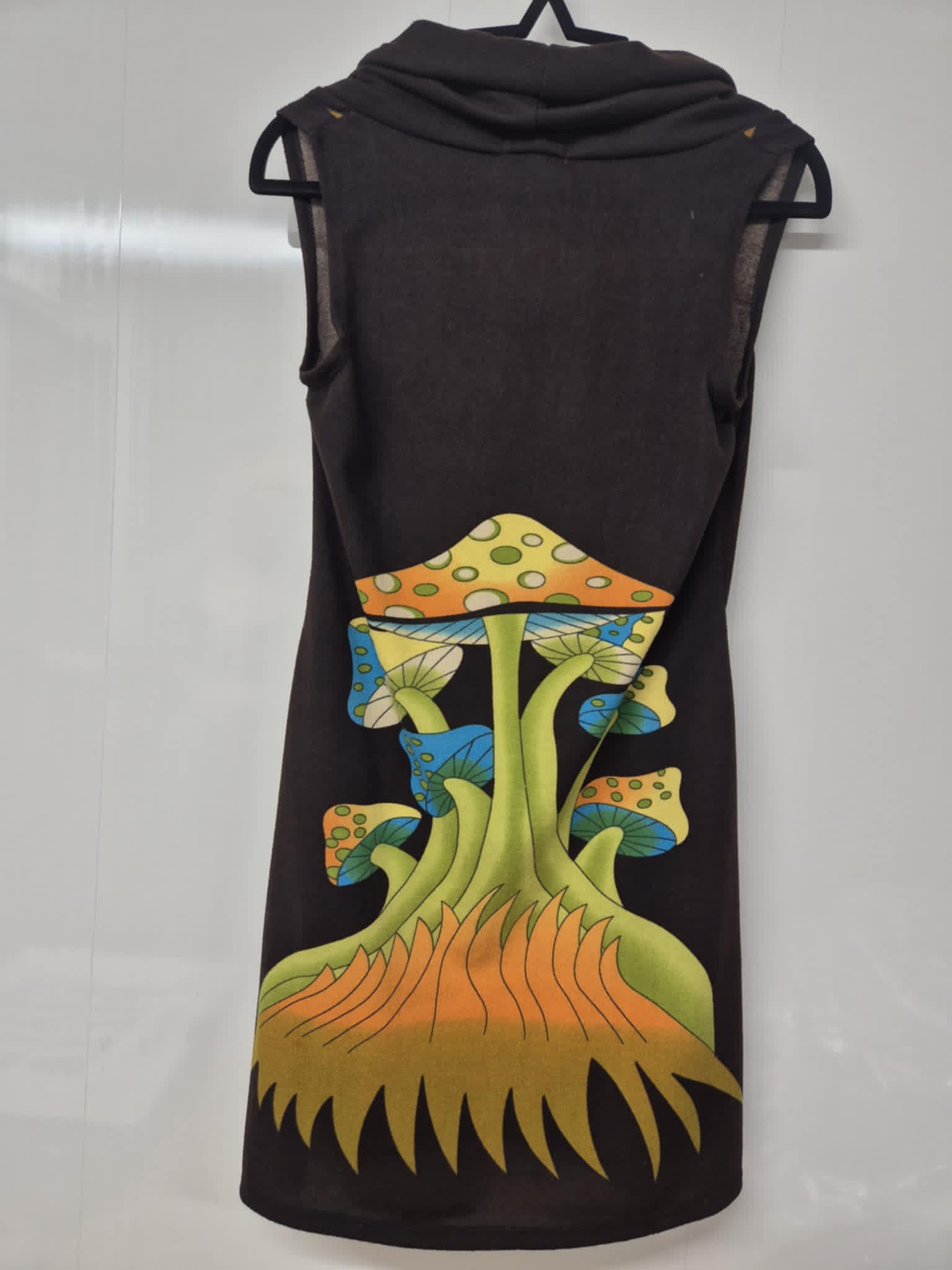 Add a touch of whimsy to your wardrobe with our Sleeveless Button Down Neck Mush Dress. This fun and flowy piece features a bold, oversized mushroom print on both the front and back — perfect for nature lovers and those with a playful sense of style. The button-down neckline adds a charming detail, while the sleeveless cut keeps it breezy and comfortable.