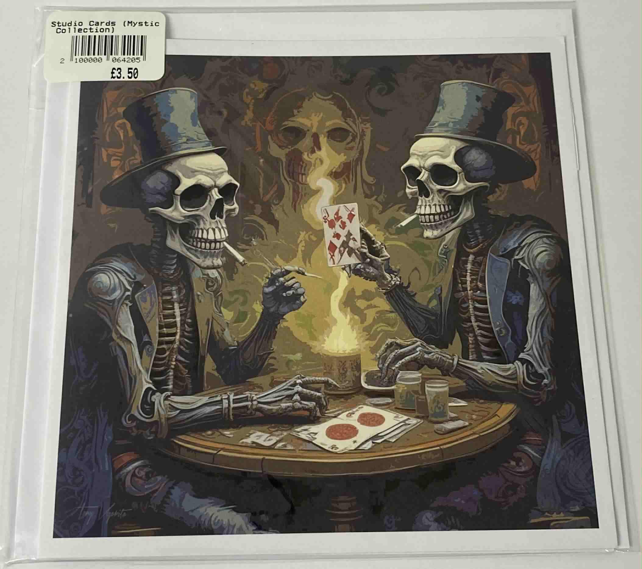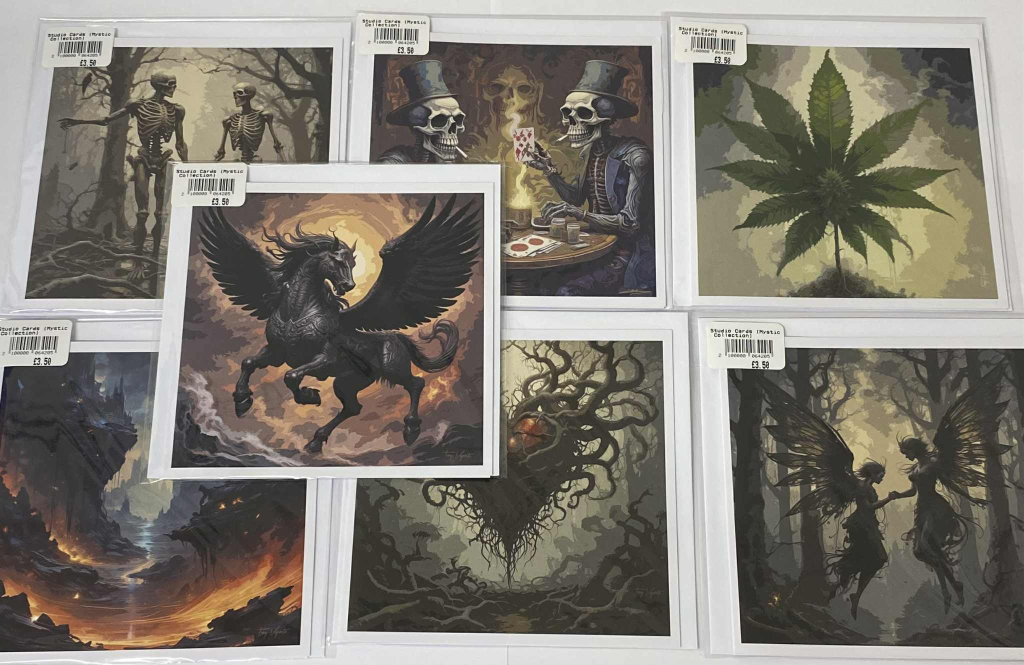 Delve into the shadows of the surreal with our Studio Cards (Mystic Collection) — a bewitching series of AI-generated art cards exploring themes of mystery, magic, and the supernatural. Featuring everything from skeletal gamblers and forest spirits to winged stallions and enchanted foliage, this collection evokes the strange beauty of the unknown.